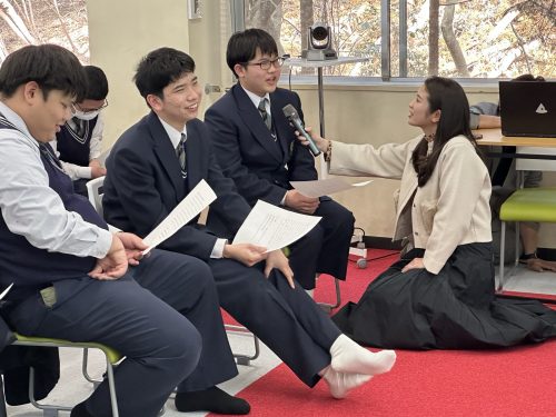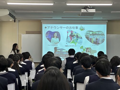 まずはテレビ局の仕事についてのお話からスタート。番組制作、報道、取材、編集など、放送の裏側には実に多くの職種が関わっていることを教えていただきました。さらにアナウンサーの仕事も、ニュース読みだけではなく、取材、原稿確認、現場リポートなど多岐にわたることを知り、生徒たちは「伝える」仕事の奥深さに引き込まれていました。